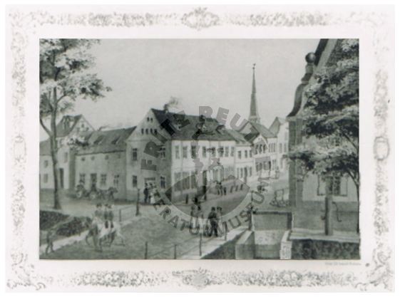 Grube und Fischbank in Rostock. Lithographie.